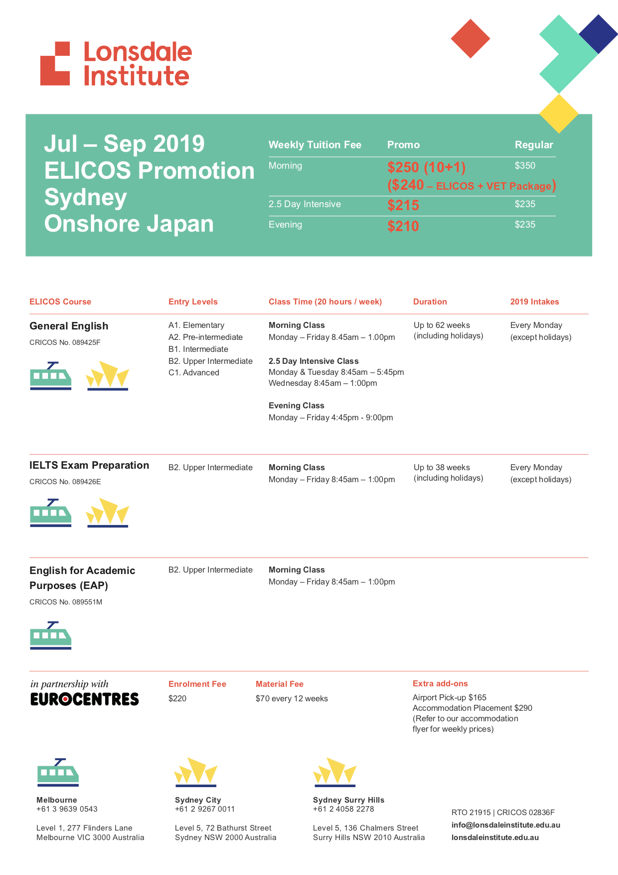 | 入学金:【学生ビザ】$220 【その他のビザ】$110 教材費:12週ごとに$70 |