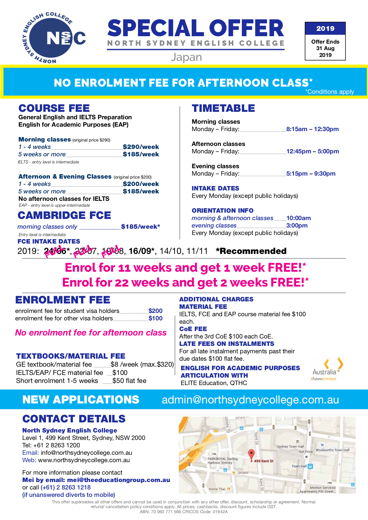 シドニーの語学学校から、割引キャンペーンのお知らせです。11週間申し込み+1週間フリー。または、22週間+2週間フリーです。11週間コースに申し込むと、1週間無料で授業を受けることができます!とってもオトクなキャンペーンです。興味のある方はトラトラまでお知らせください。