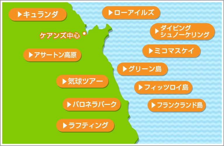 グリーン島はケアンズから一番近い島!フェリーの時間も選べて半日(午前/午後)で遊びにいけます。グレートバリアリーフに浮かぶ島の中では知名度ナンバーワンではないでしょうか?マリンアクティビティが豊富なのでダイビング等を楽しみたい方にもおすすめです。泳ぎたくない方はグラスボトムボートでサンゴ礁の世界をのぞいてみましょう!