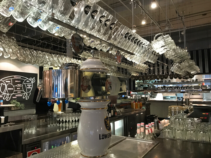カウンター席に腰を落ち着かせると、目の前に飛び込んでくるのは上からフックで吊るされ、まるでシャンデリアのようなジョッキ達。