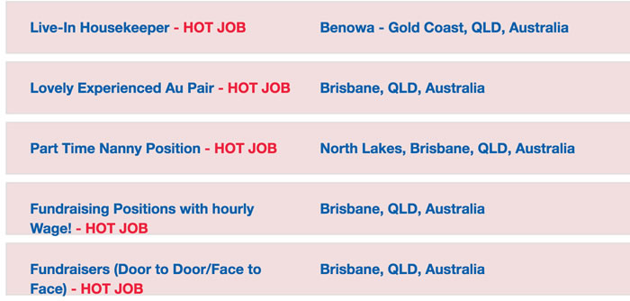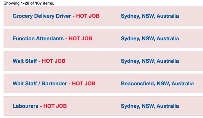 派遣会社のオフィスは、シドニー、ブリスベンにあるので、各オフィスで仕事カウンセリング(英語)を受けることが可能です。各都市で紹介している仕事トップ3をみてみましょう。仕事内容は常に変動するので、あくまでも参考にしてください。
