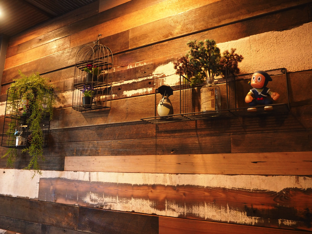 お店は木目調の家具でぬくもりを感じることができ、壁もオシャレで所々に日本のアニメなどの小物が置いてあったりします。