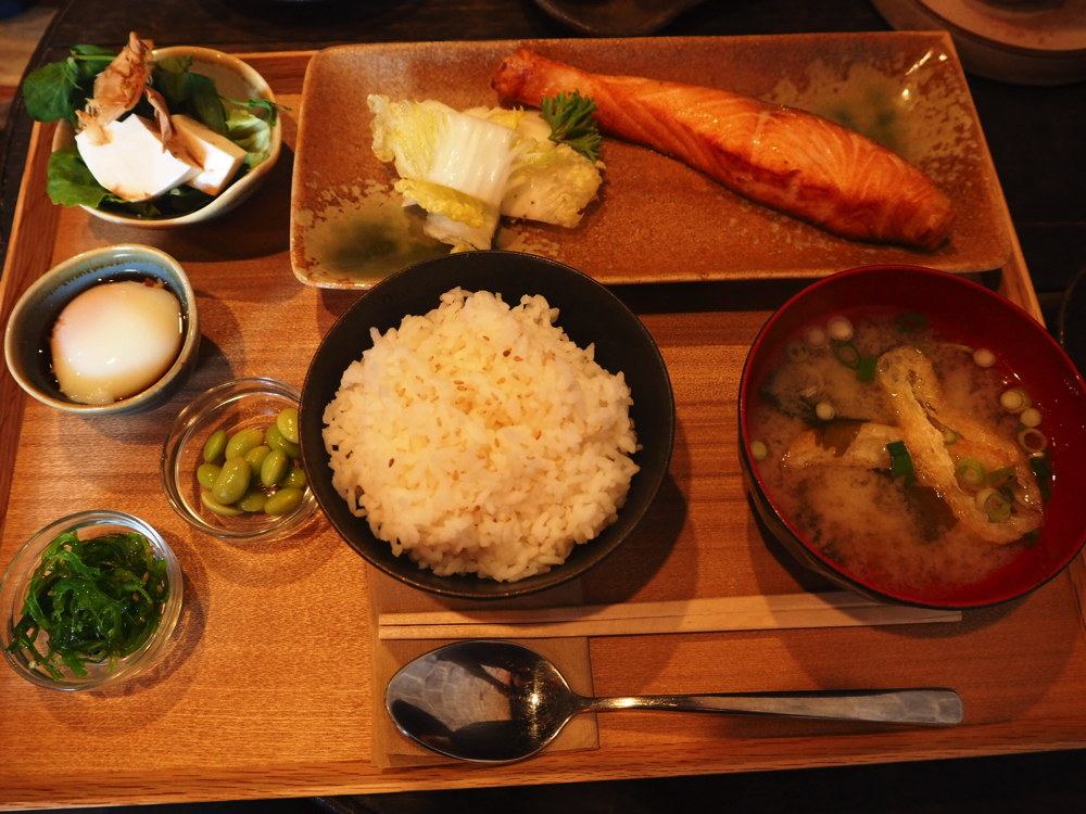 サーモンはミディアムレアのような焼き加減でとても美味しく、温泉卵や味噌汁・小鉢もついてまさに日本!という感じでした。