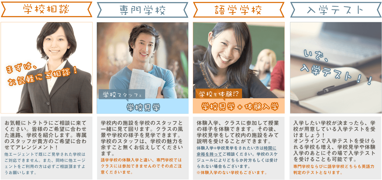まず、トラトラの学校セクションでは、英語学校並びに専門学校をご紹介させていただいております。