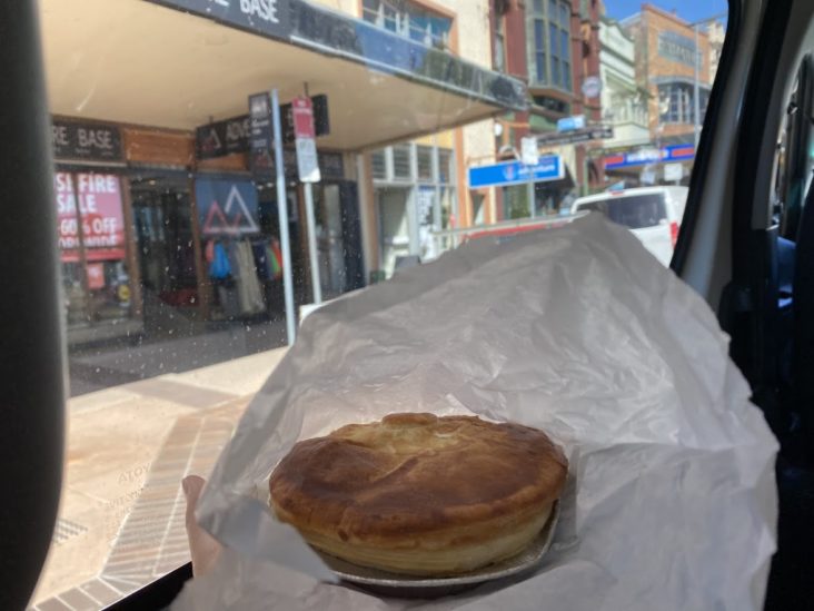 シーニックワールドまでお昼を待つと時間が遅くなるということで、クリスさんおすすめの 「Hominy Bakery 」というお店のミートパイをバスの中で移動中に頂きました。焼きたてでアツアツのミートパイはとてもおいしかったです。