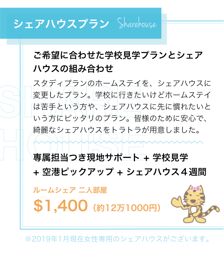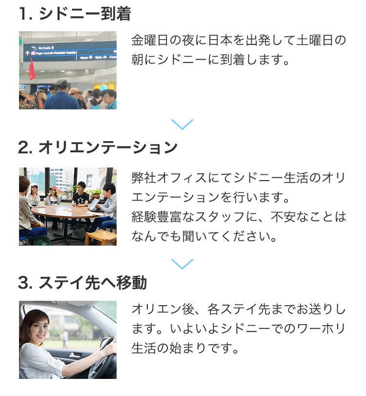 シドニーへの到着は、毎週土曜日の午前中にお願いします。トラトラの担当が、他に到着する学生などがいないか確認した上で返信いたします。