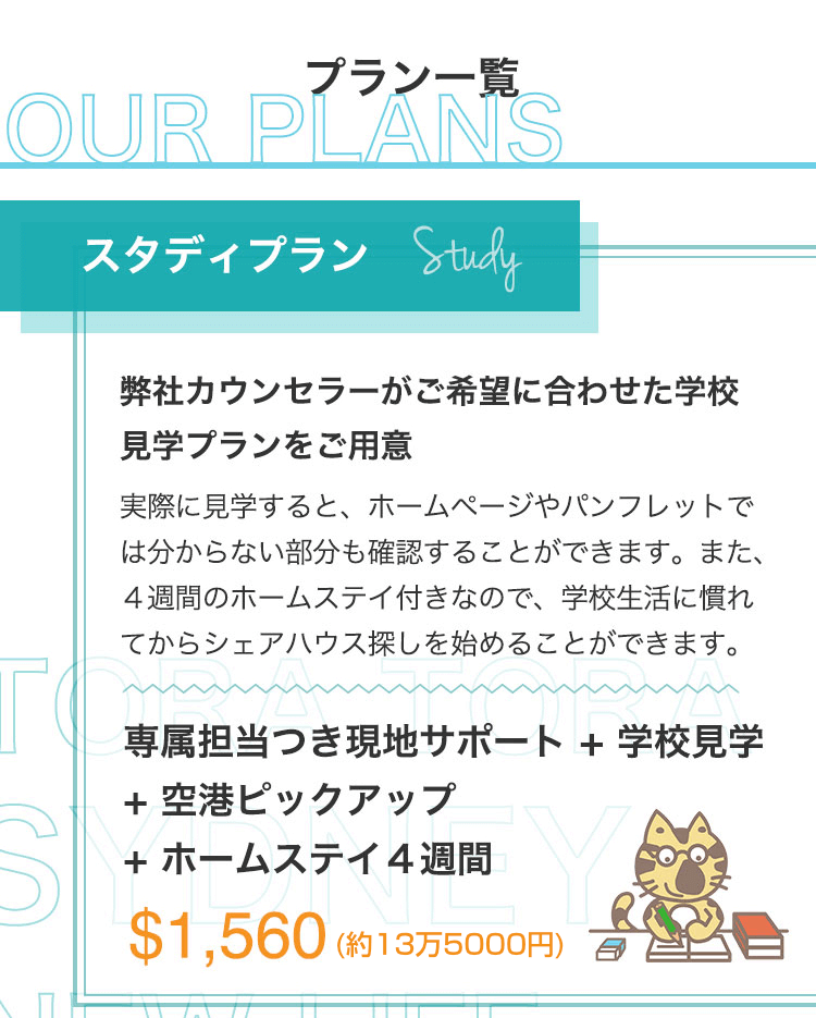 シドニーに到着後、3校〜5校の語学学校を見学して、自分にあった学校を選んで決めることができる。これがスタディプランのメリットです。