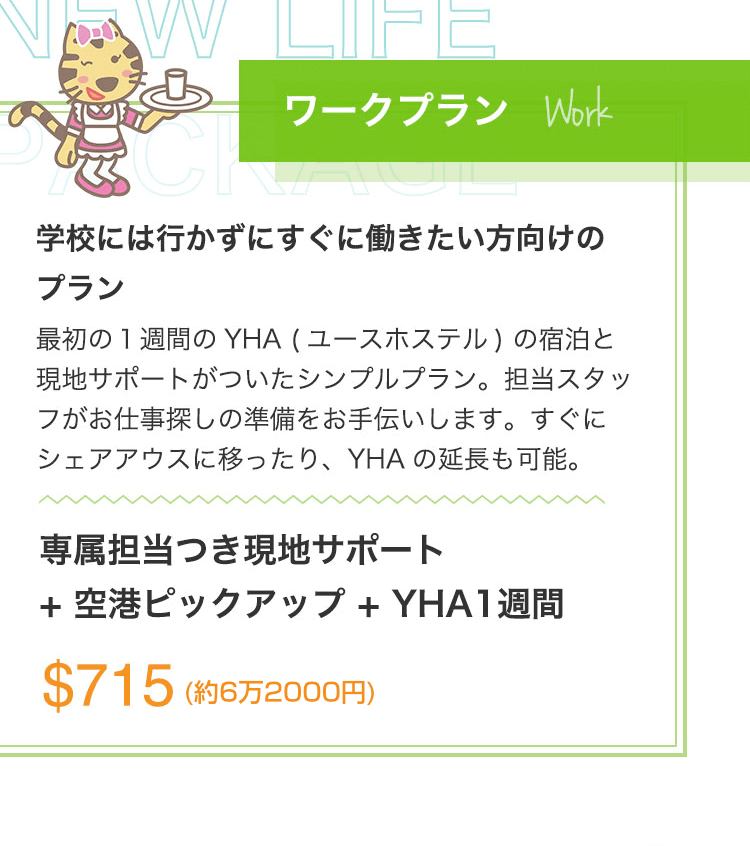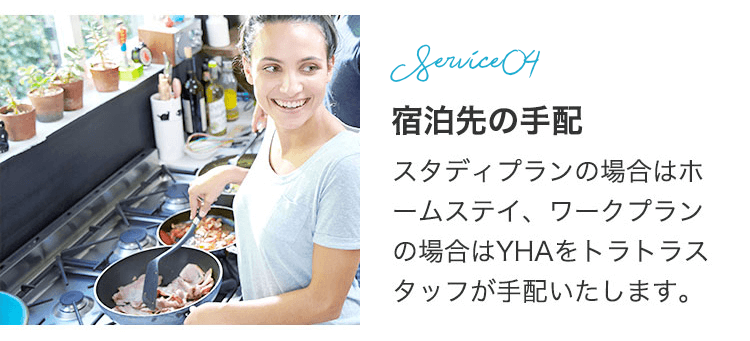スタディプランは、ホームステイでの滞在となりますので朝と、夕食が付きます。ワークプランはユースホステルでの滞在となりますので、食事は付きません。