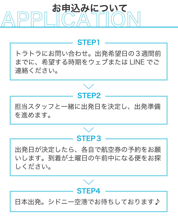 トラトラの担当と相談しながら日本出発日などをきめてから航空券の取得をお願いします。ホームステイやユースホステルに空席があるか確認した上で、担当からシドニー到着日をお知らせいたします。その後、航空券の取得をお願いしております。(航空券の料金はプランに含まれておりませんので、各自で購入をお願いします)